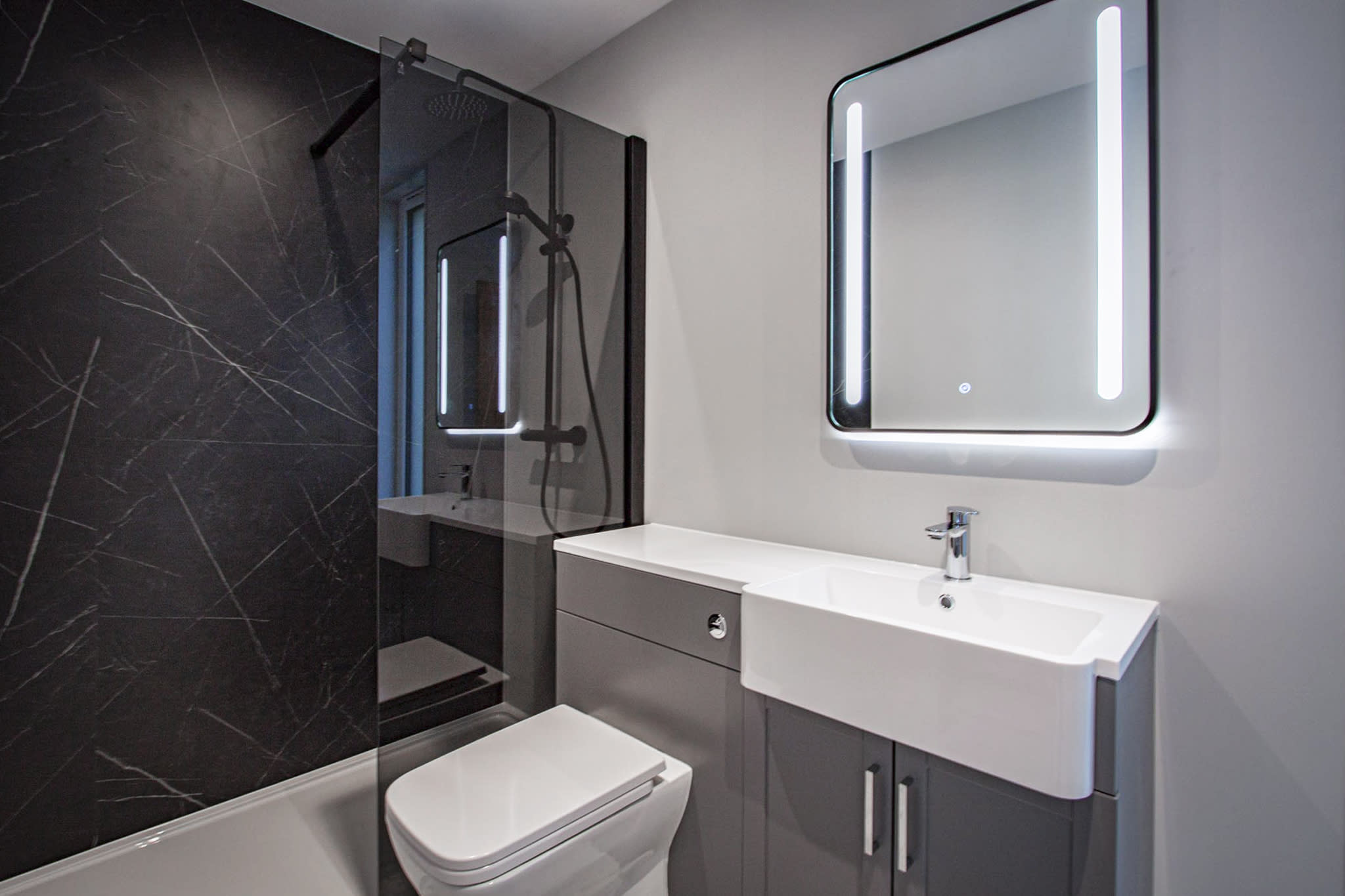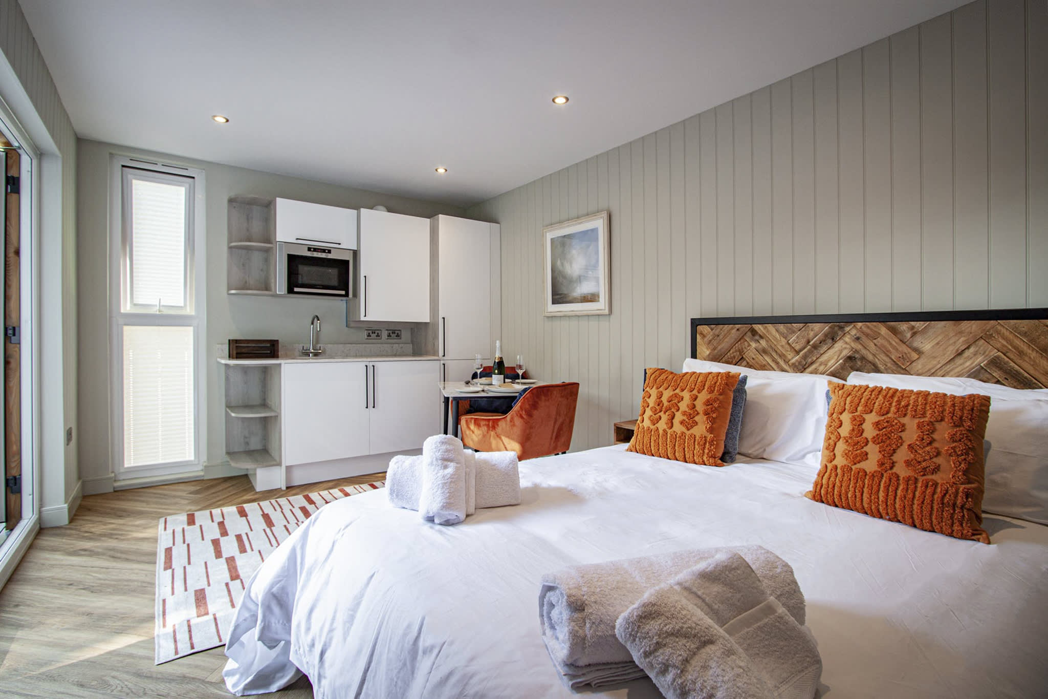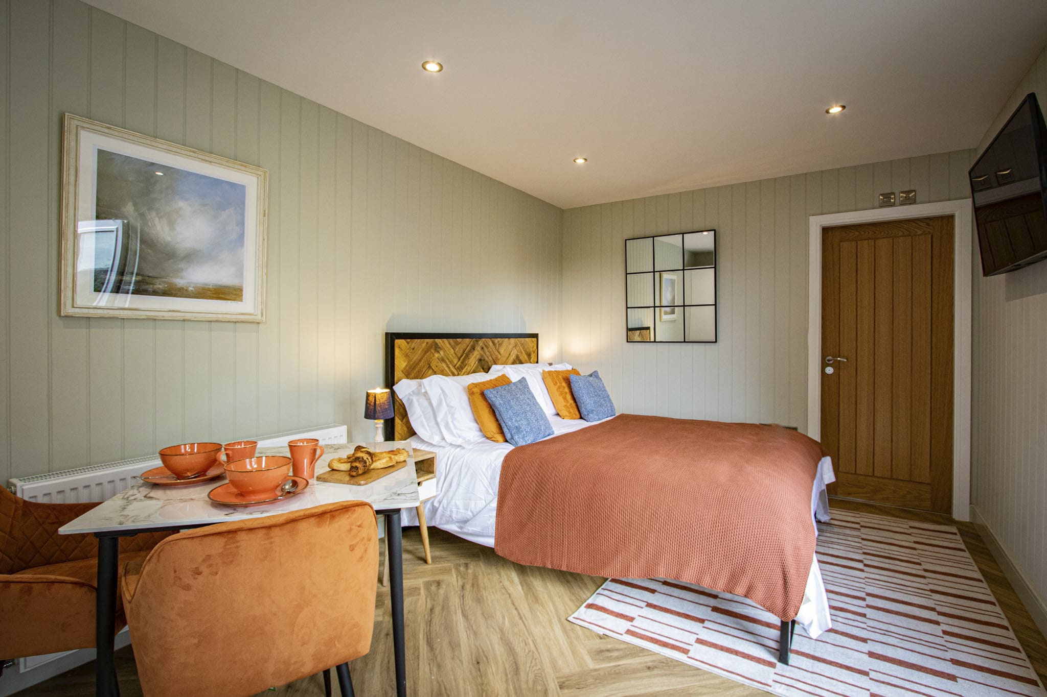 Unwind on the spacious king-sized bed with bedside tables and lamps, ensuring a restful night’s sleep. Stay entertained with the mounted smart TV and pamper yourself in the ensuite shower room with its large rain showers, complimentary toiletries, and cozy bath robes.