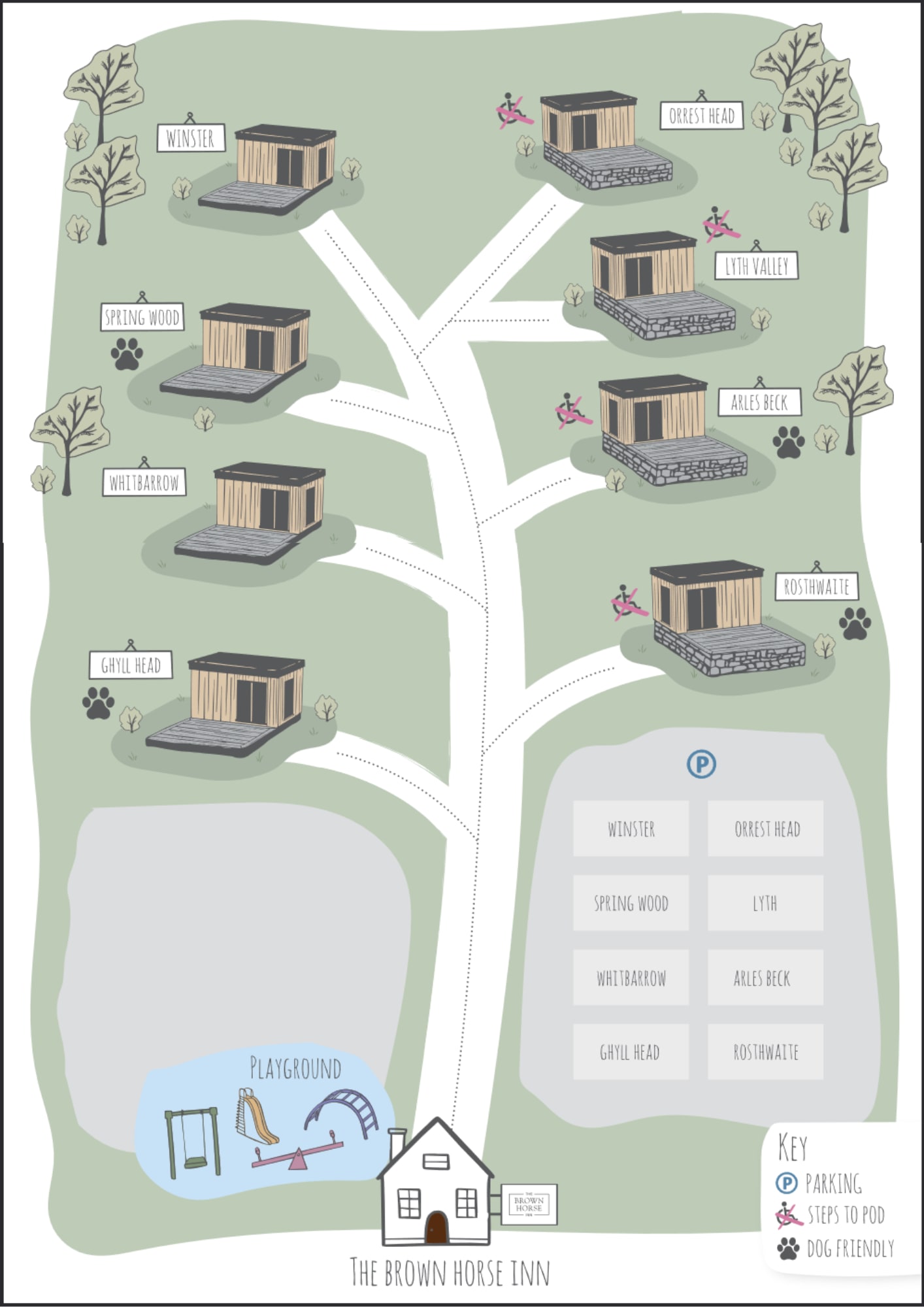 Pets are welcome; however, they are only allowed into select pods, these are the Ghyll Head, Spring Wood, Arles Beck, Lyth Valley and the Rosthwaite.