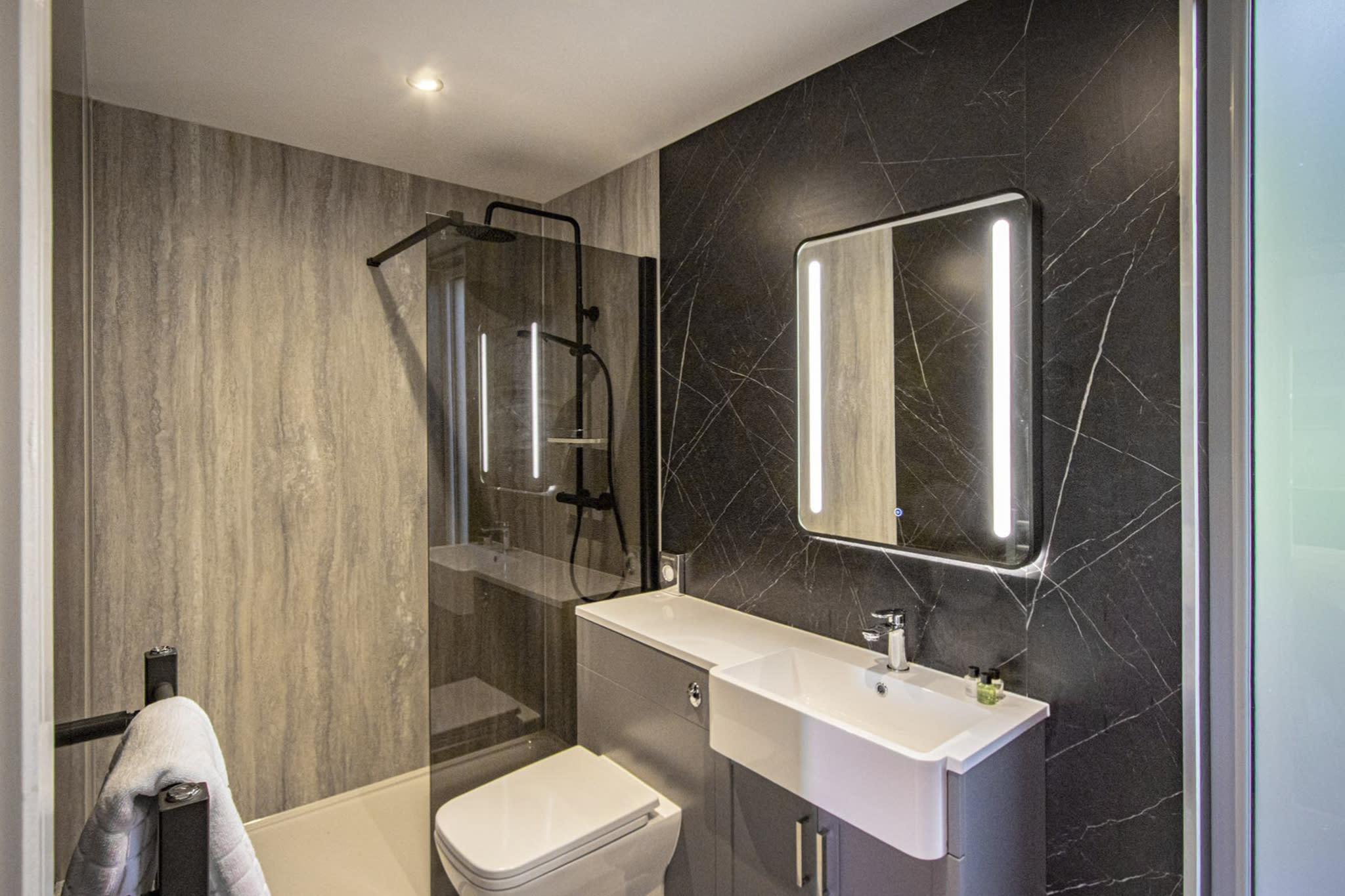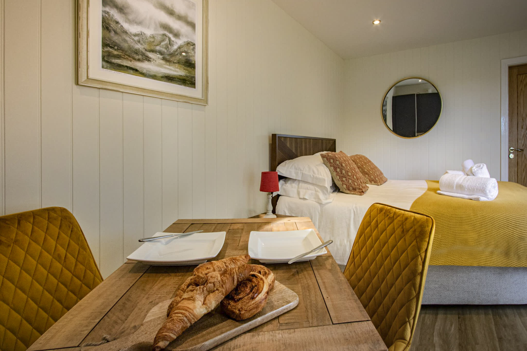 Unwind on the spacious king-sized bed with bedside tables and lamps, ensuring a restful night’s sleep. Stay entertained with the mounted smart TV and pamper yourself in the ensuite shower room with its large rain showers, complimentary toiletries, and cozy bath robes.