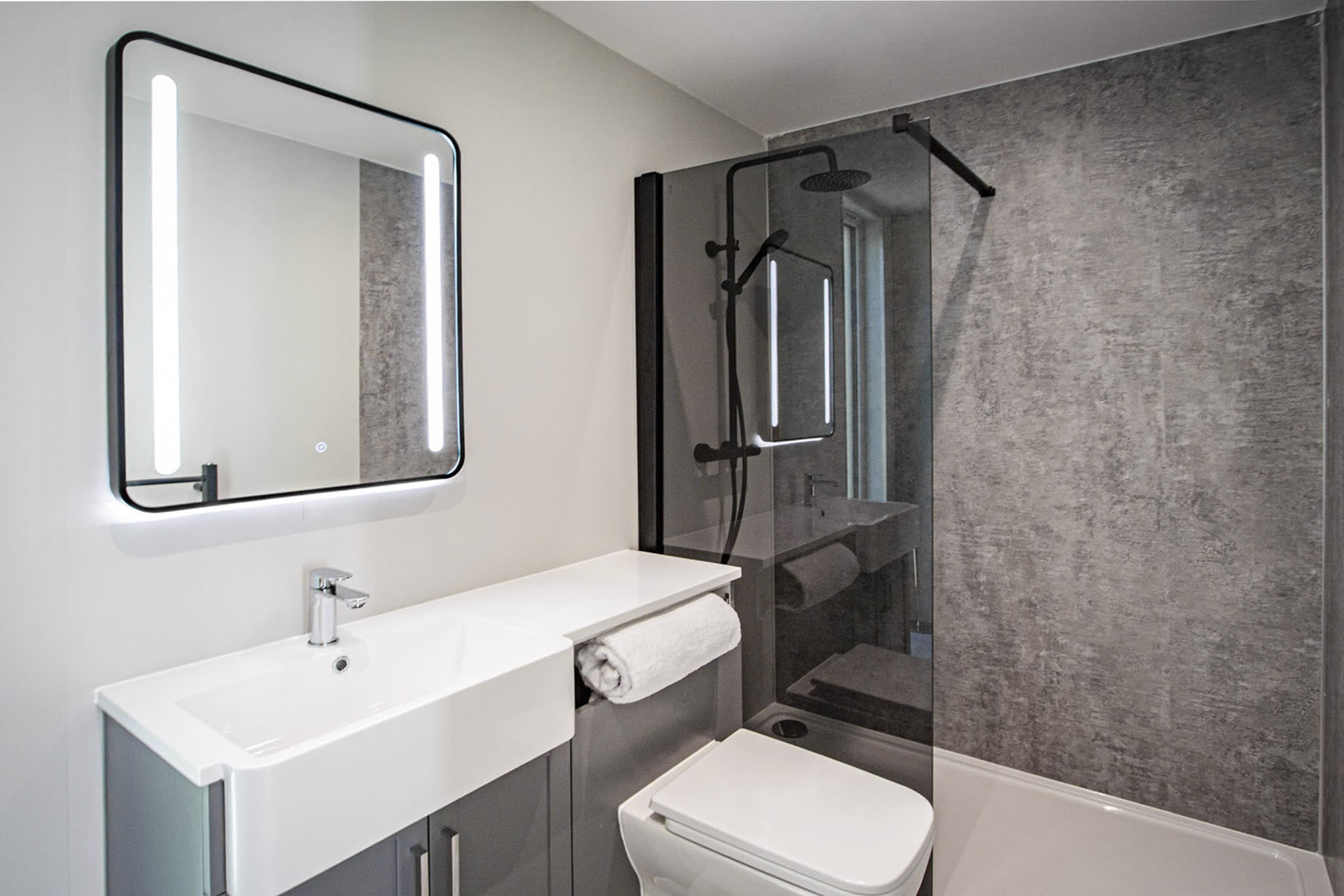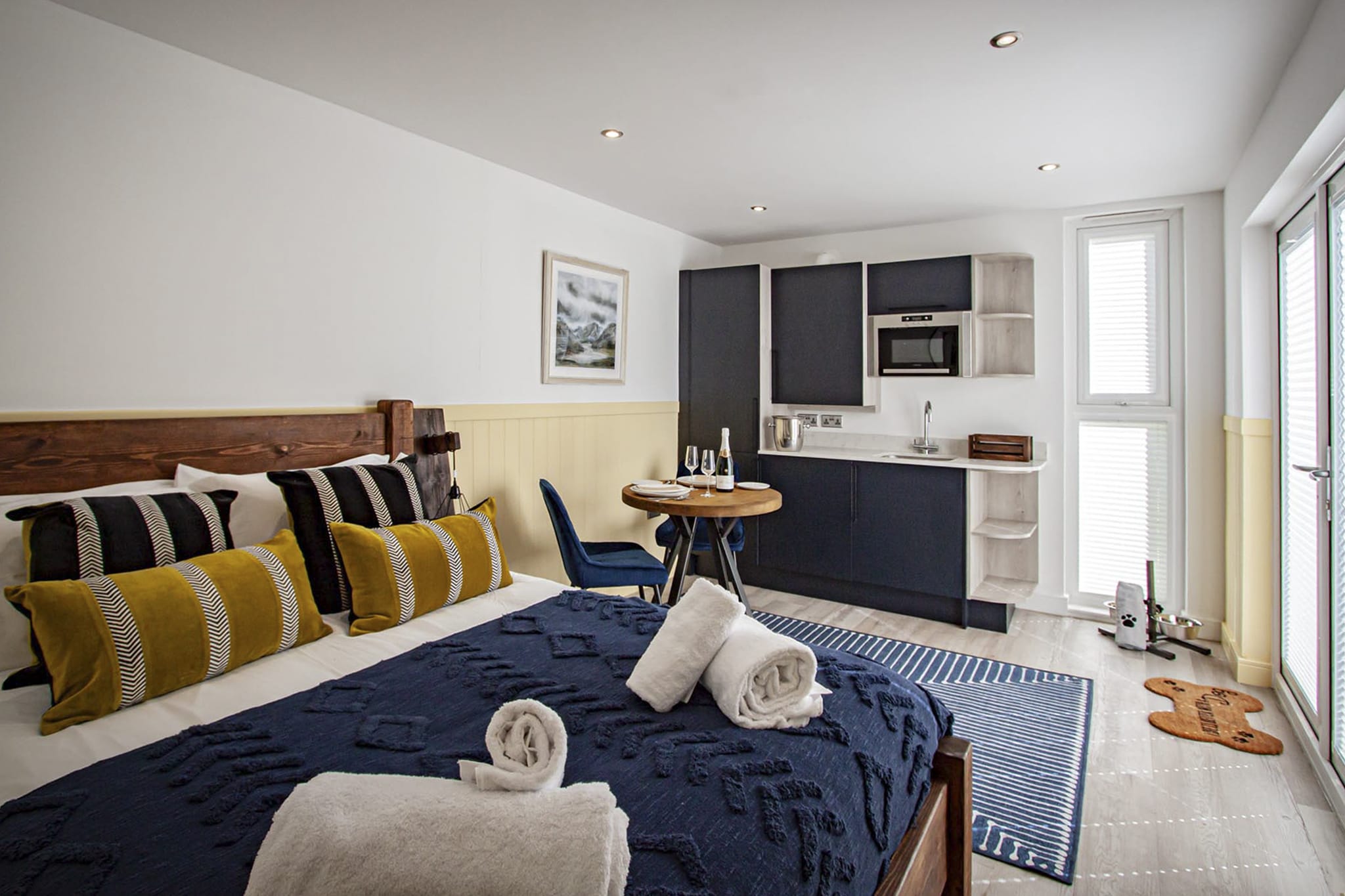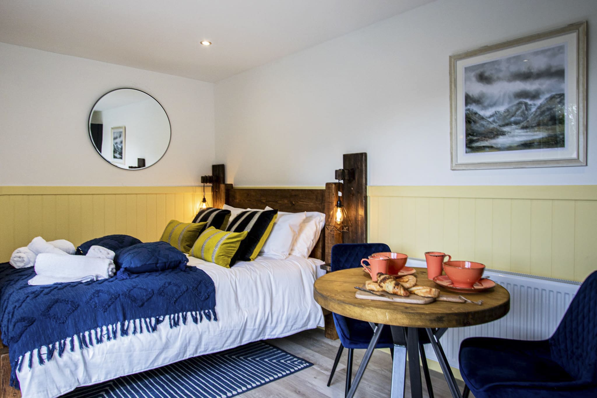 Unwind on the spacious king-sized bed with bedside tables and lamps, ensuring a restful night’s sleep. Stay entertained with the mounted smart TV and pamper yourself in the ensuite shower room with its large rain showers, complimentary toiletries, and cosy bath robes.
